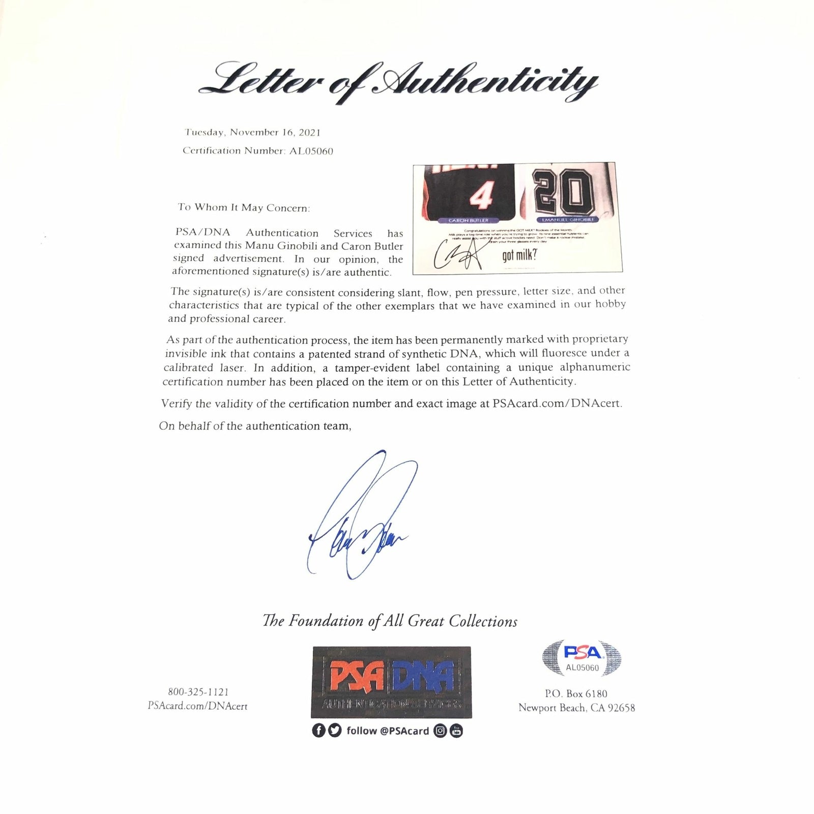 Manu Ginobili Caron Butler Signed 12x23 Advertisement PSA/DNA San Antonio Spurs