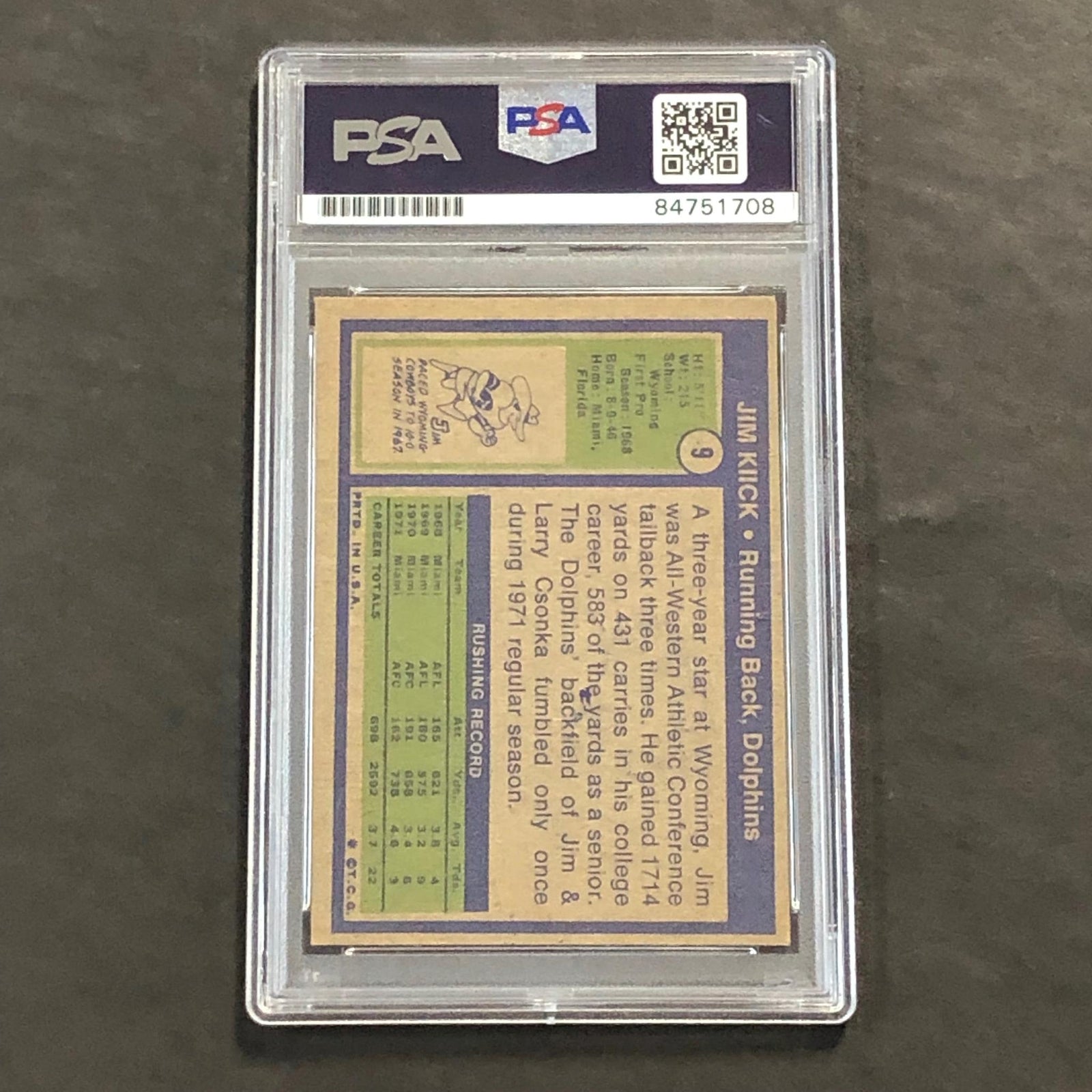 1972 NFL #9 Jim Kiick Signed Card AUTO PSA Slabbed Dolphins